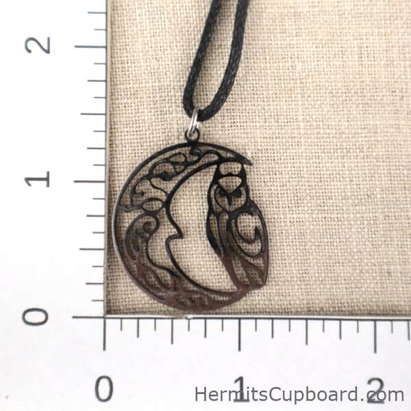 Your Crescent Moon and Owl Necklace is a 1.13″ x 1.25″ laser cut stainless steel pendant with a 35″ wax cotton cord. Tie the wax cord to length or tie it with an adjustable slip-knot.