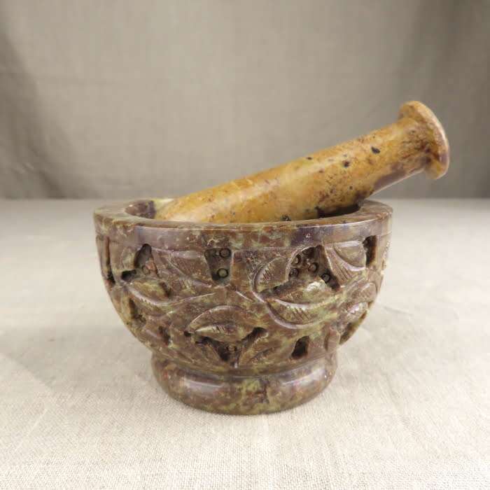 Extremely hard roots, barks, and resins are best ground in a hard stone (granite, marble) or metal mortar and pestles like brass, bronze, or iron.