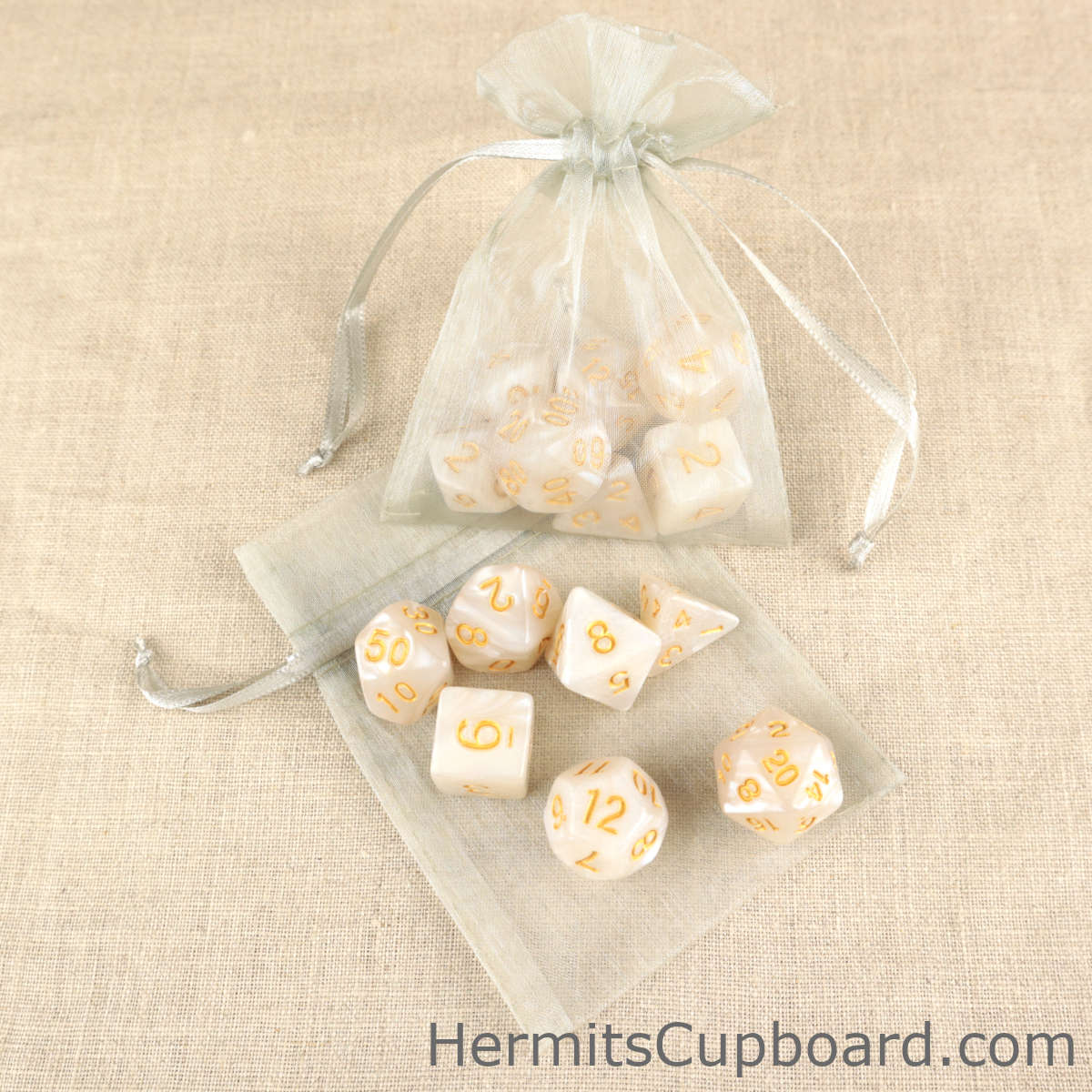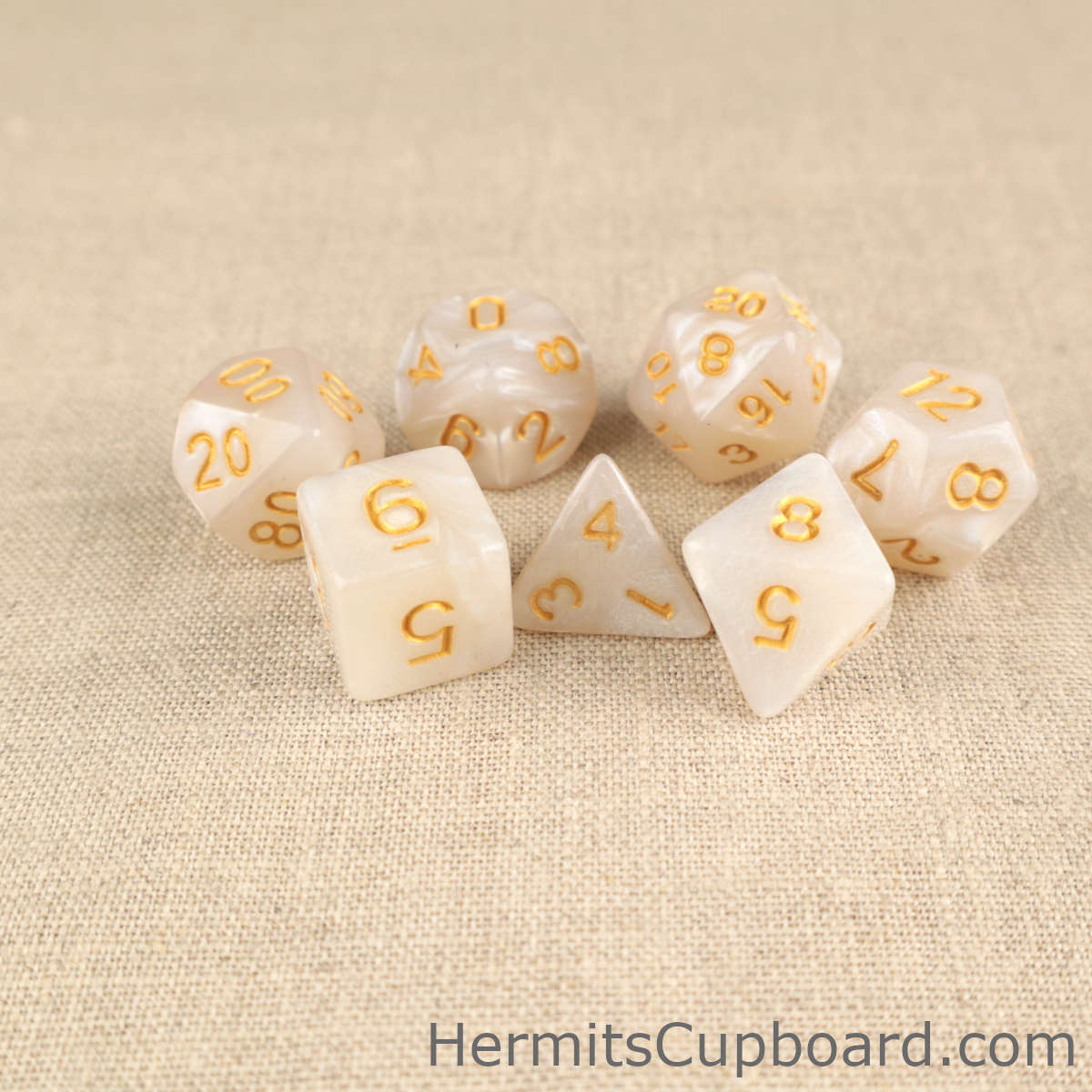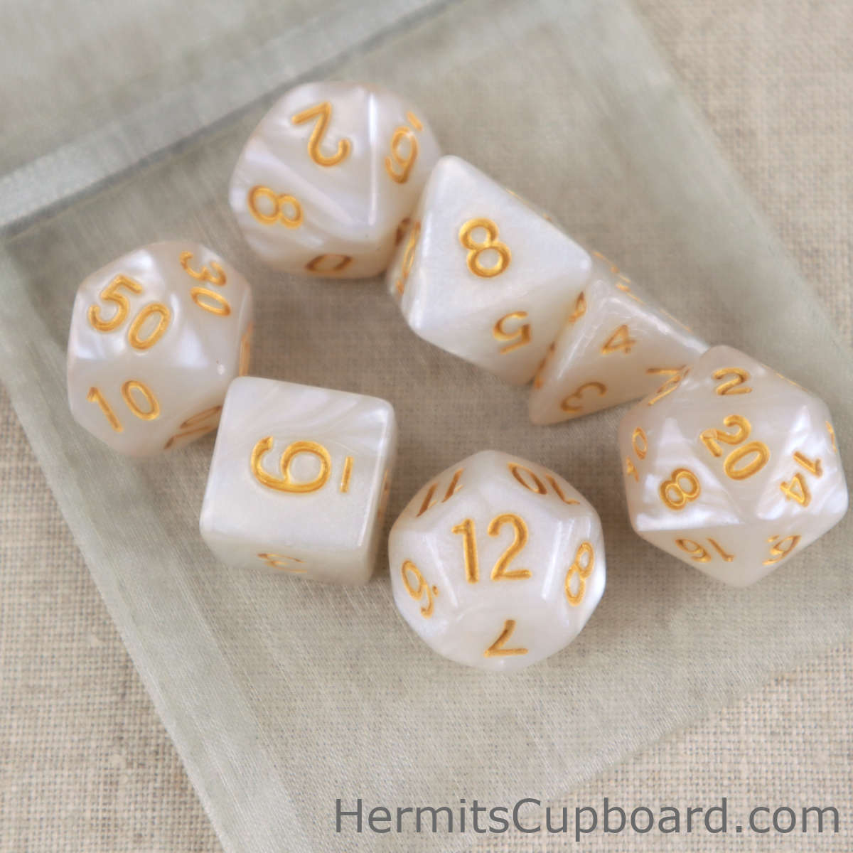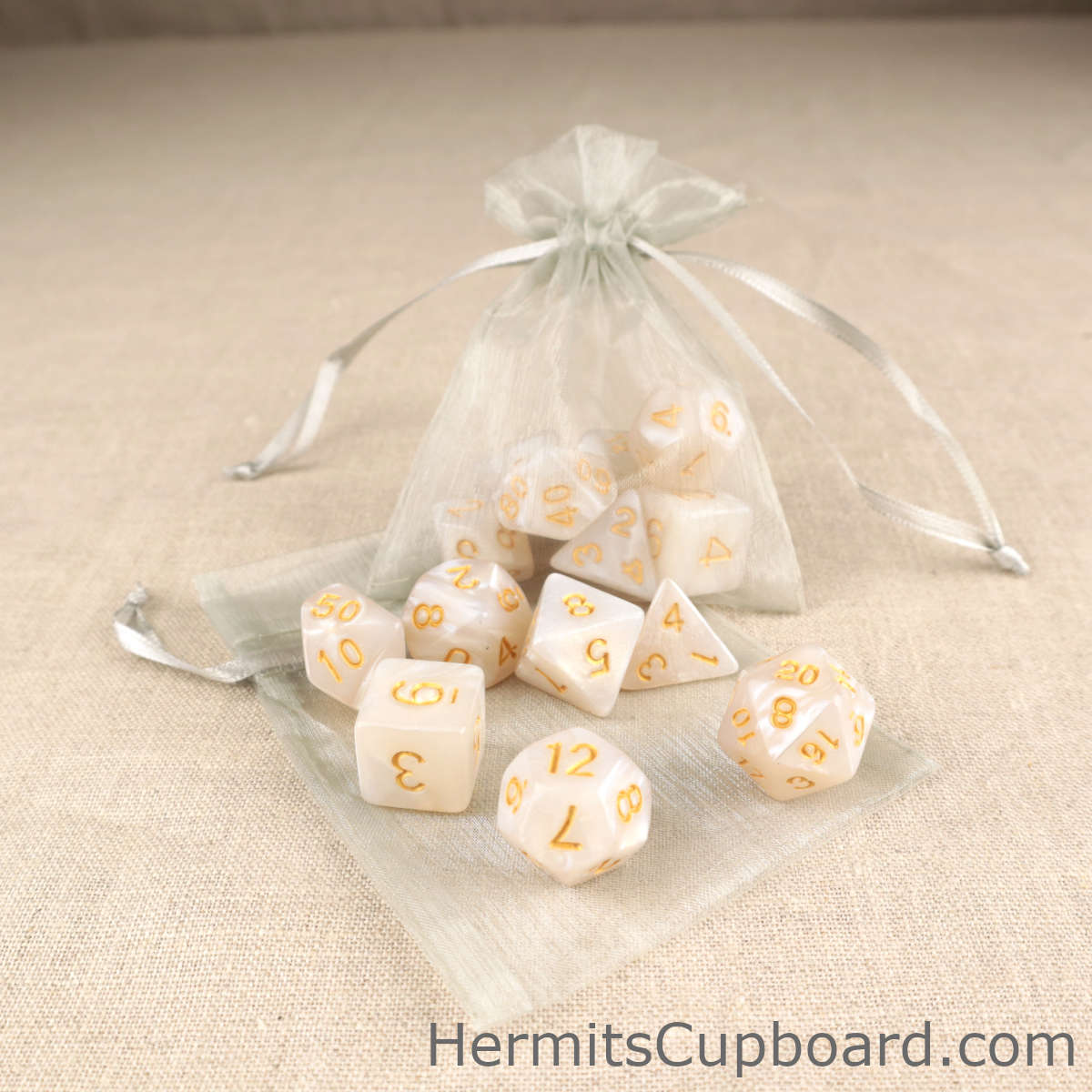 Using white polyhedral dice for divination readings is a fascinating practice rooted in ancient traditions. The style of dice you chose is important. Divination is a message from the divine which is why we chose these dice that are pearl-opalesque white with gold numbers. Simple, yet profound- white for pure light and gold for, well, being gold.